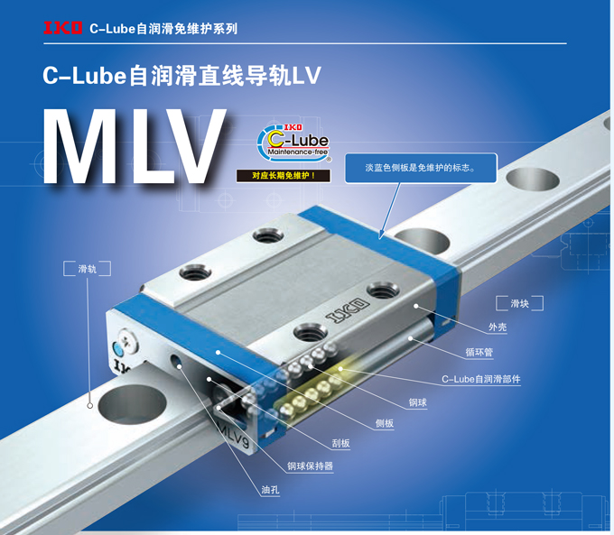 通过在滑块的钢球循环管中内置毛细管润滑体“C-Lube自润滑部件”,实现了长期免维护。当滚动体接触到毛细管润滑体表面时,在表面张力的作用下,润滑油不断地供给到滚动体表面。
