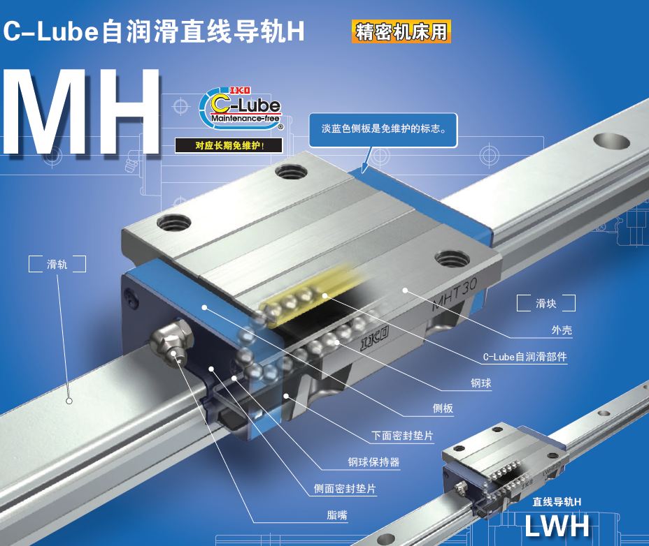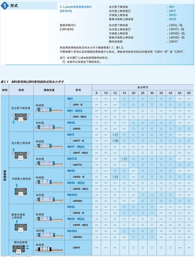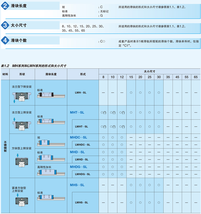 滑块以法兰型为主,还有宽度窄的方块型、横向安装型等共5种类型,滑块长度在相同的截面尺寸下有3种不同的类型,用户可根据机械、装置的规格选择合适的产品。